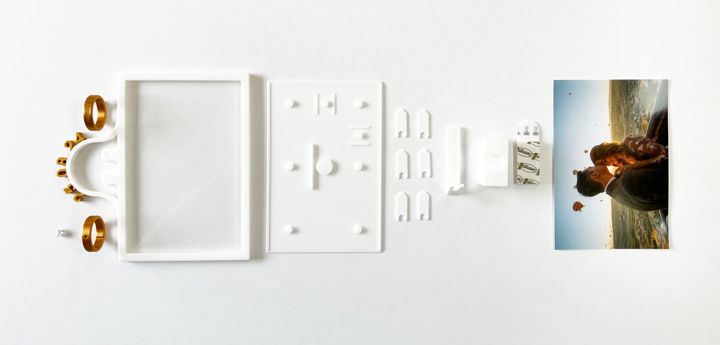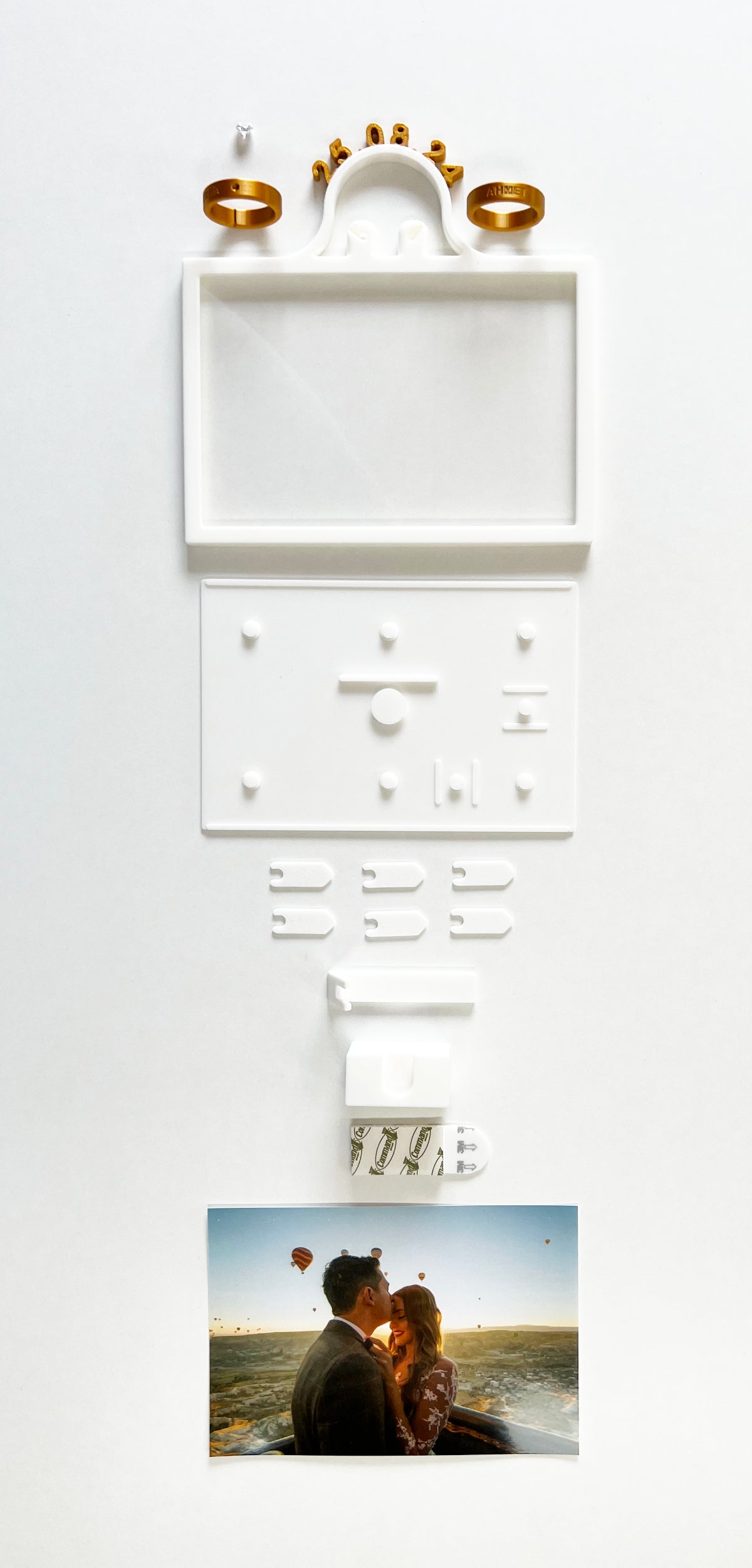 Im folgenden Bild zeigen wir unseren Marriage Bilderrahmen in Einzelteilen. Nach dem Druck und der anschließenden Qualitätskontrolle der 15 Teile erfolgt der Zusammenbau. Klicke auf die „+“-Zeichen für weitere Informationen.