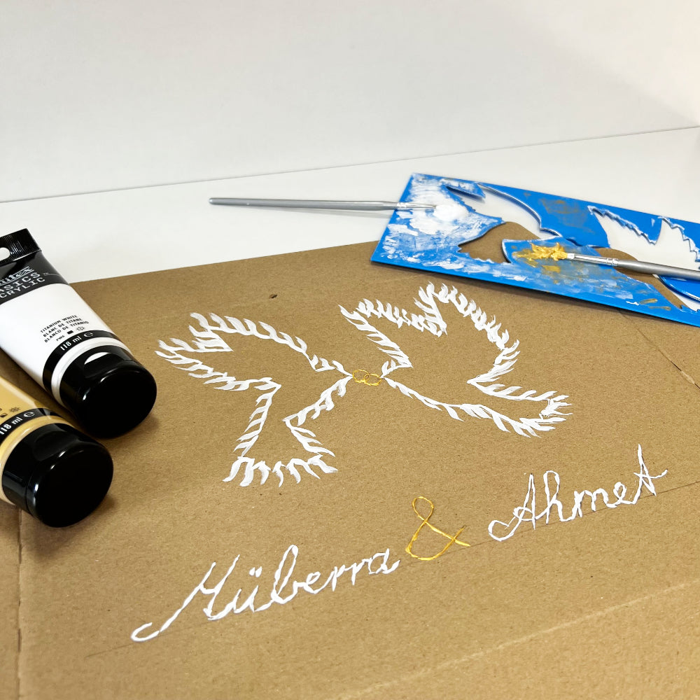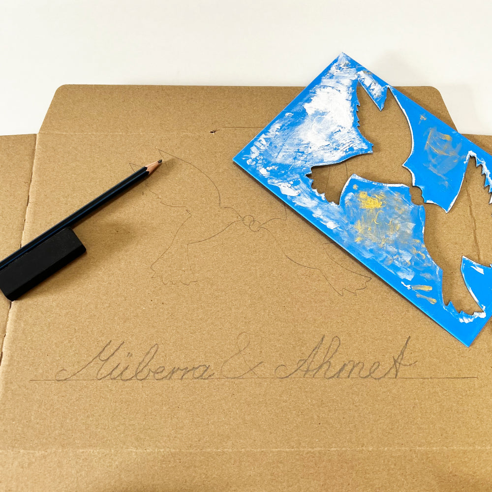 Zuerst werden mithilfe einer Schablone die Tauben und Ringe auf der Innenseite des Kartondeckels gezeichnet. Direkt darunter die Namen der Ehepartner in kursive Handschrift.