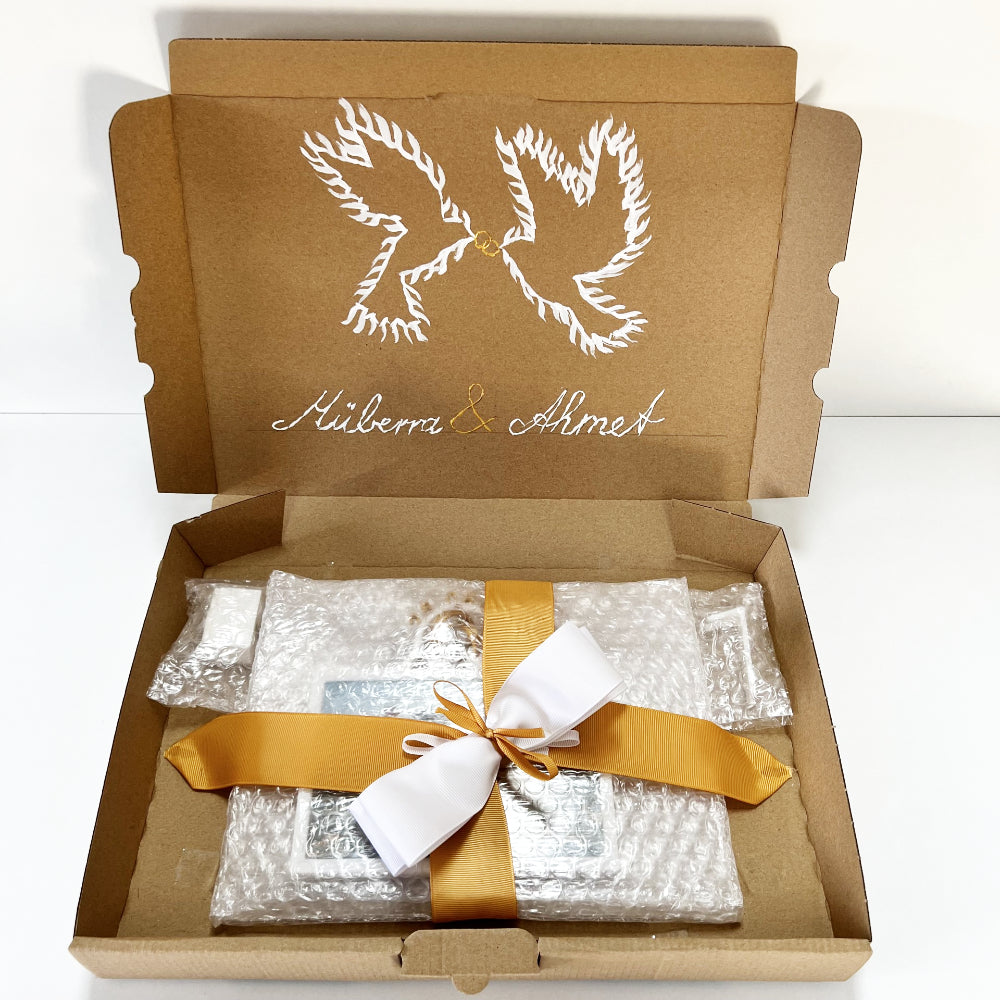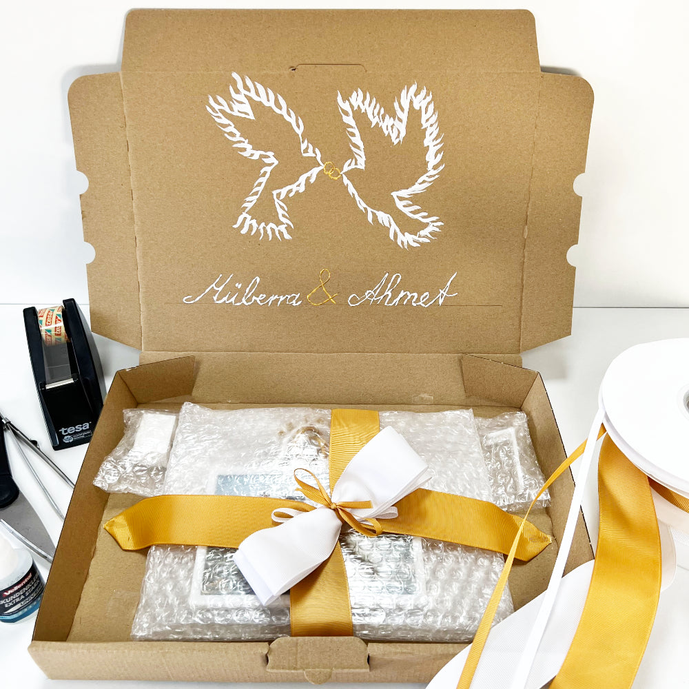 Bereits die Verpackung spiegelt die Liebe zum Detail wider. Zwei weiße Tauben, die je einen goldenen Ring halten, zieren die Innenseite – ein Symbol für die unzertrennliche Verbindung des Paares. Darunter sind die Namen des Ehepaars in Acryl-Weiß aufgemalt, während das "&"-Zeichen in Acryl-Gold von Hand gepinselt wurde. Eine elegante goldene Schleife, perfekt abgestimmt auf das Seidengold des Rahmens, vollendet die Präsentation. Ein erster Eindruck, der Vorfreude weckt.