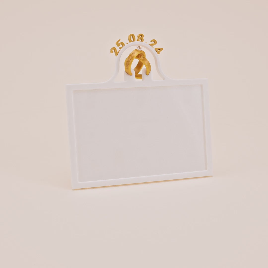 Der Rahmen selbst ist in einem edlen Jadeweiß gehalten, während die Akzente – wie das Hochzeitsdatum und die Eheringe – in einem luxuriösen Seidengold schimmern. Diese Kombination aus dezenten und glänzenden Tönen verleiht dem Produkt eine zeitlose Eleganz.